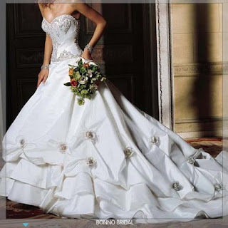The flower motiff is important this year. Whether it be on a skirt or the bodice, the rose petal design is showing up all over.