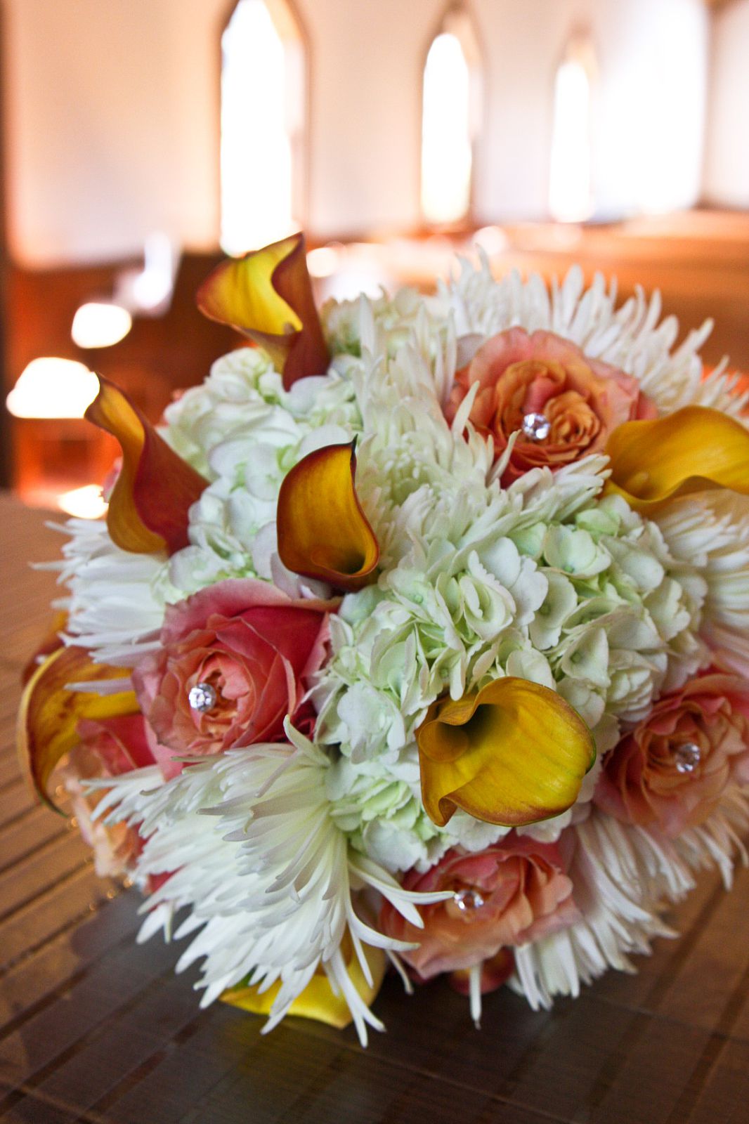 Natalie was a gorgeous bride! Her colors - vivid shades of orange and pink - were tempered with black; a perfect combination for this couple. Their wedding Ceremony was held at the Church of the Land at Living History Farms. This is an historic working complex of Farms and Museums in the heart of Des Moines. The church is beautiful, yet simple and has a serene feel to it when you walk in - like an unspoiled gem in the middle of the busy hustle of life. Many brides choose this church for the very fact that you don't need to add a lot of decorating to have an elegant service.